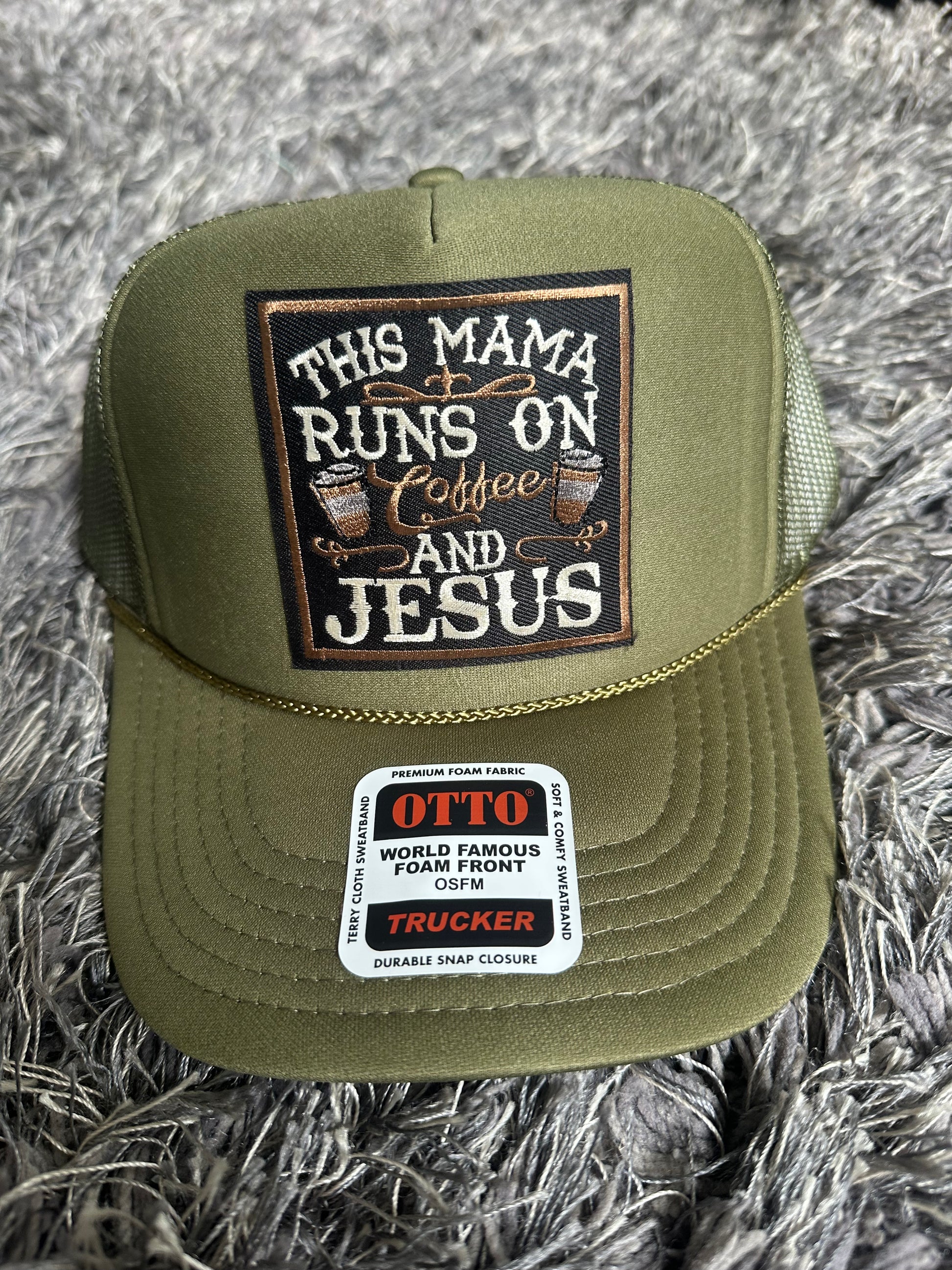 “THIS MAMA RUNS ON COFFEE AND JESUS” Trucker hat